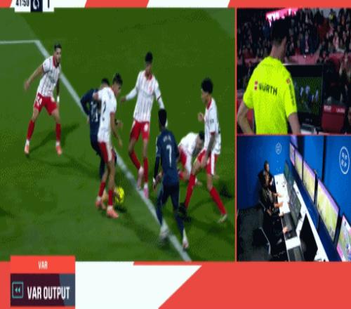 第22分钟,皇马还是左路发起进攻,维尼修斯禁区前沿强行突破杀入禁区左脚大力抽射,皮球稍稍高出横梁。第26分钟,赫罗纳右路范进,齐甘科夫禁区前沿左脚大力兜射,门将库尔图瓦扑救脱手,不过他倒是抢在瓦纳特补射之前将球扑住。第40分钟,皇马前场围攻造成门前一片混乱,混战中姆巴佩转身将球捅入网窝,主裁在VAR确认后,认定姆巴佩手球在先,进球被吹掉。上半时最后1分钟,赫罗纳右路快速反击,林孔快速推进45度角横传中路,齐甘科夫前点策应巧妙将球往中路做,无人防守的奥纳希点球点前迎球右脚大力兜射,皮球应声入网,赫罗纳半场结束前1:0打破僵局。