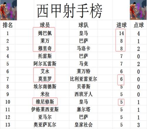 射手榜方面,姆巴佩今天点射建功后,再拉大领先优势,比第2的莱万,穆里奇多了6球。托雷斯,阿尔瓦雷斯7球并列第4。莫里罗今天梅开二度,追上艾永,两人6球并列第6。维尼修斯无力破门,还是和亚马尔,奥亚萨瓦尔等人5球刚好挤入前十。
