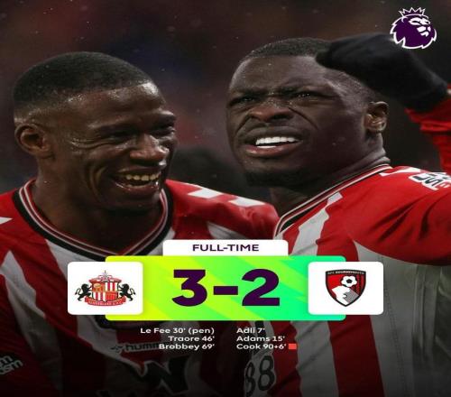 英超第13轮,桑德兰主场3-2逆转击败伯恩茅斯,这是桑德兰队史首次在英超落后2+球的情况下逆转取胜。